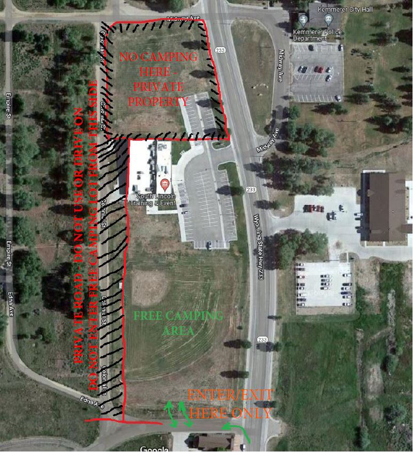 RV and other self-contained vehicles will be allowed parking in the old baseball field located by the South Lincoln Event Center, located at 220 WY Hwy 233. There are no facilities at this site and dumping of water is prohibited.